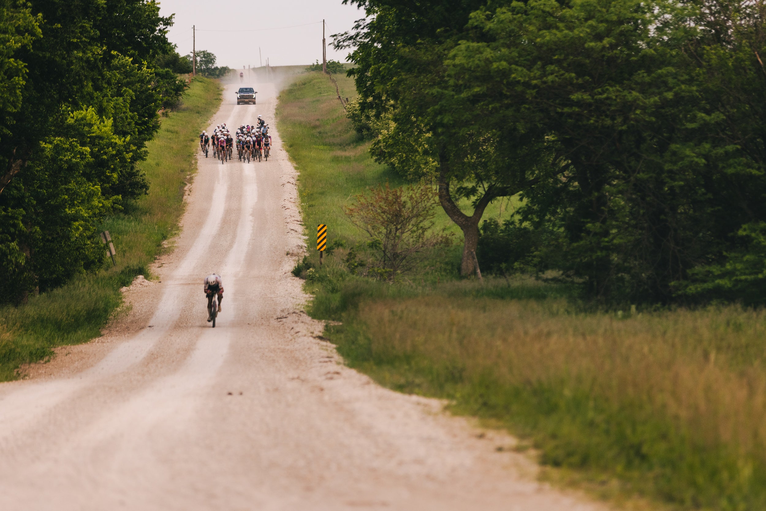 The energy was intense at the start of Unbound, as the gun went off riders were immediately fighting for position while multiple pace cars got swallowed up by the group before we hit the dirt. My goal for the first 50 miles was to be present and unseen, not the easiest task at Unbound. Pretty quickly a large group got away with some strong riders, but I felt like watching the race play out was the best choice. We slowly clawed the group back as we rode through some of the sketchier roads on course around mile 40 before reconnecting with the front group around mile 50. Once we regrouped though, we realized that 3 riders had already snuck off the front. Our regrouping had taken the wind out of the group's sails while Cam Jones, Simon Pellaud and Lespy had slipped off the front. Before I knew it, 5 more guys had gone, and we were quickly watching the race slip away from us before we even hit the first feed zone.