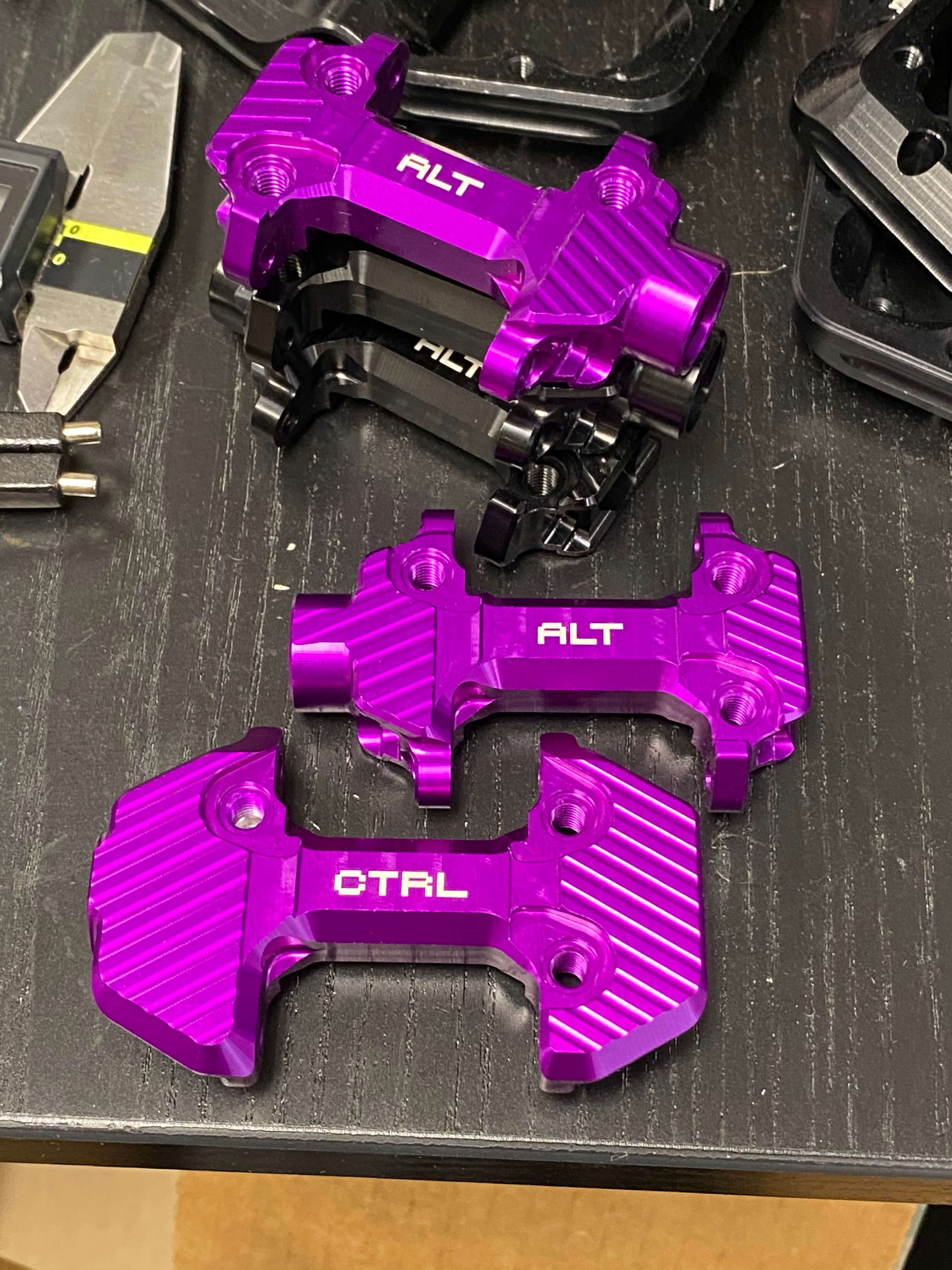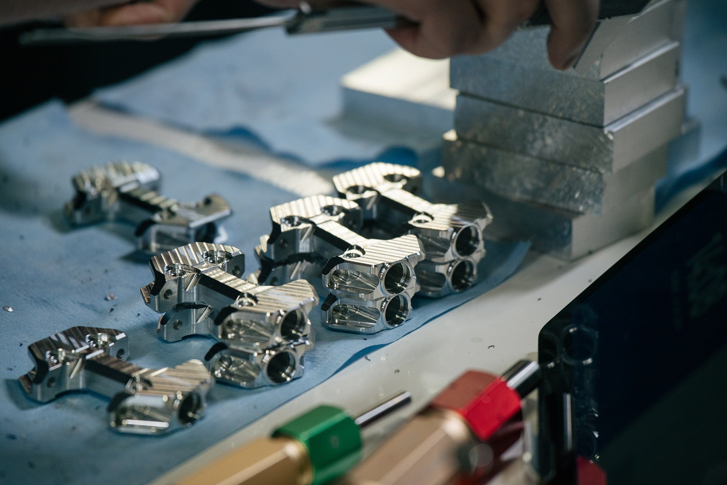 Production pedal bodies are back from anodizing, hit the laser machine, and are set up in assembly for batch building.
