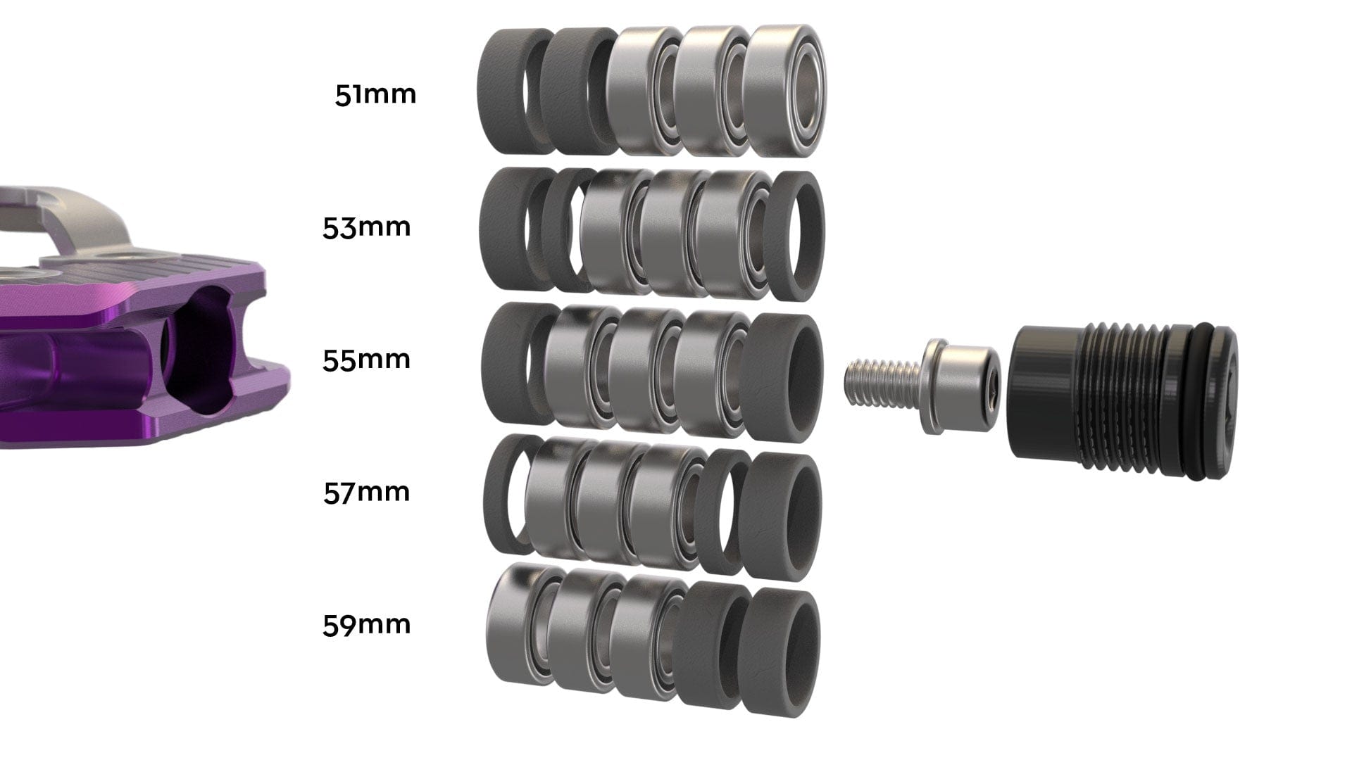 Q factor adjustability is also important in connecting as many shoe types as possible with our new clipless pedals. We define Q factor with clipless pedals as the distance from the axle flange to the center of the binding mechanism. The most common distance for clipless pedals is 55 mm and this is also what we have chosen for the middle position of Wolf Tooth pedals. Unlike most other pedals, the CTRL + ALT + DEL family can be adjusted to 51 or 59 mm as well with the spacers built into the pedals. We also have a separate kit of 2 mm spacers available to add Q factor options of 53 and 57 mm.