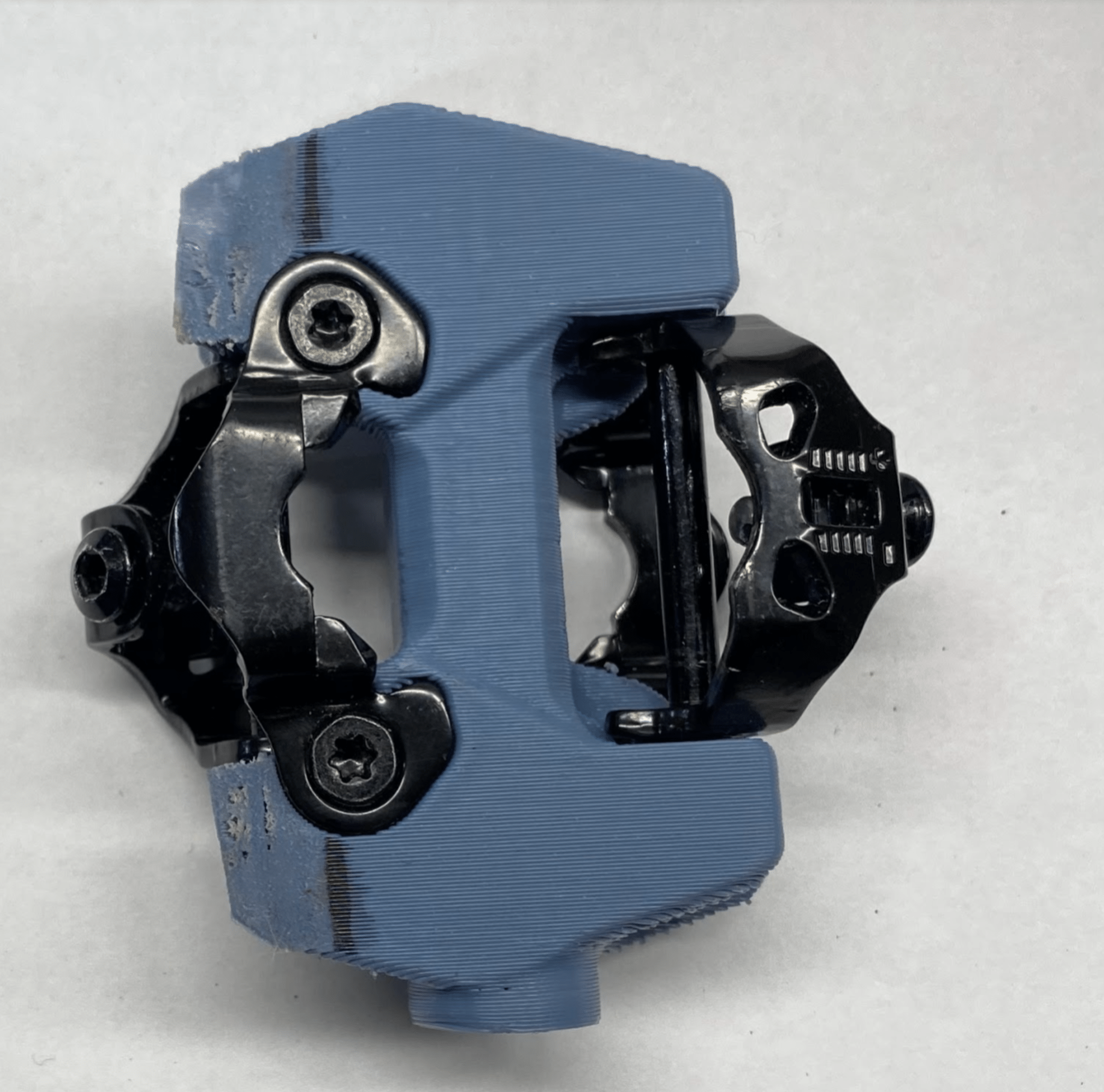 The first 3D Printed prototype pedal body was paired with salvaged clip in binding parts from a competitor pedal body to start working on pedal design architecture.