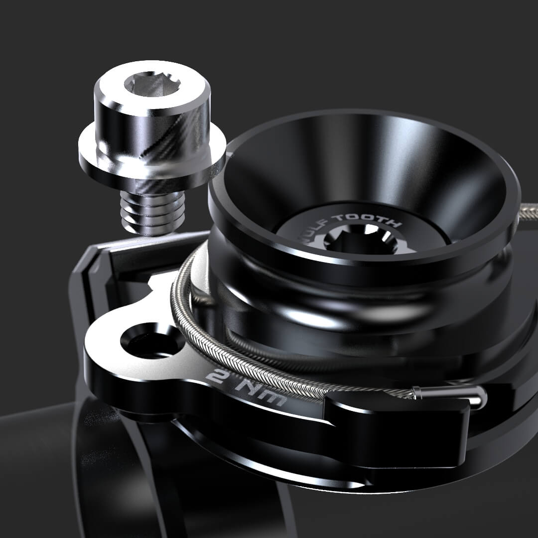 ReMote Pro uses CNC machined aluminum for every major component including the lever, base, cam, and mount. An anodized Wolf Tooth chainring bolt and three stainless steel screws hold everything together. Solid, reliable and beautiful -- another future classic from Wolf Tooth.