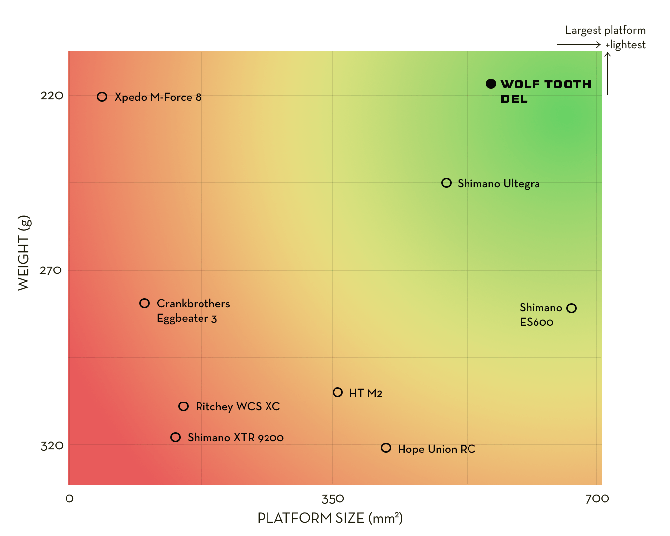 Larger platform area for power transfer than the competition at 559 mm² (compared to Xpedo MF8 at 46 mm², Shimano XTR 9200 at 144 mm² and Eggbeater 3 at 102 mm²)