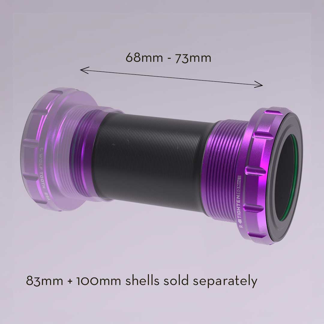 Our adjustable-width design allows the same BB shell to be used for 68mm - 73mm width BSA Bottom Brackets. 83mm DH shells and 100mm Fat Bike shells are available as add-ons for our BSA Bottom Brackets.